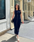 Stap stijlvol de dag door met deze elegante midi jurk. De chique knoopsluiting en vrouwelijke pasvorm zorgen voor een classy look, perfect voor zowel een zakelijke meeting als een avondje uit. De zachte stof en subtiele split maken het dragen comfortabel en flatterend. Combineer met hakken voor een luxe uitstraling of draag met sandalen voor een casual chic vibe.
